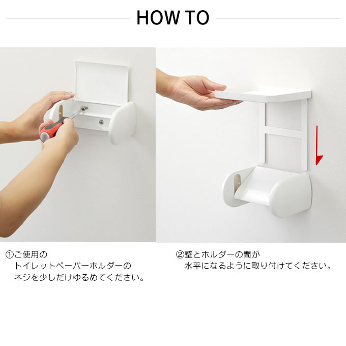 トイレットペーパーホルダーに差し込むだけの簡単取り付け! ホルダーの上が収納スペースに。