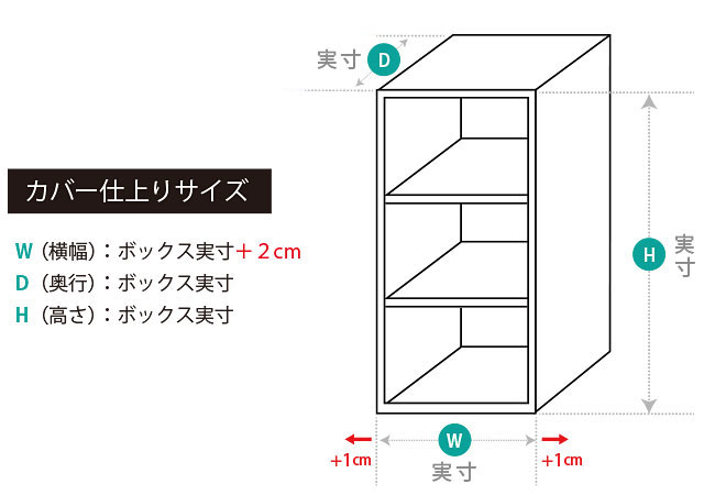 ビニールカバー|仕上りサイズと対応サイズについて ビニールカバーの仕上がりサイズは、定番のカラーボックスの実寸サイズから、 W(横幅)を、プラス2cm程度大きくお作りしています。
